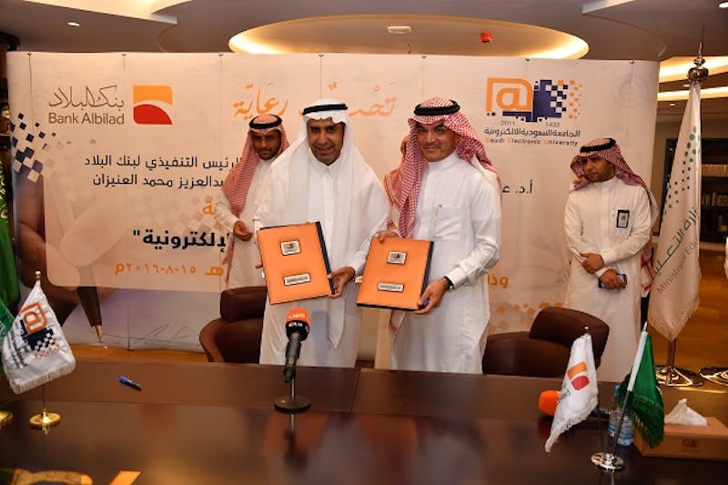 وقع سعادة مدير الجامعة السعودية الإلكترونية الأستاذ الدكتور عبدالله بن عبدالعزيز الموسى وسعادة الرئيس التنفيذي لبنك البلاد الأستاذ عبدالعزيز بن محمد العنيزان في مقر الجامعة الرئيسي بالرياض اتفاقية لإنشاء كرسي بحثي يختص بالتجارة الإلكترونية بمسمى "كرسي بنك البلاد للتجارة الإلكترونية"، ويبحث الكرسي في مجال إدارة الأعمال والأنشطة التجارية عبر تقنية المعلومات والوسائط الالكترونية الحديثة لاسيما مع النمو المتزايد في التجارة والأعمال الالكترونية.