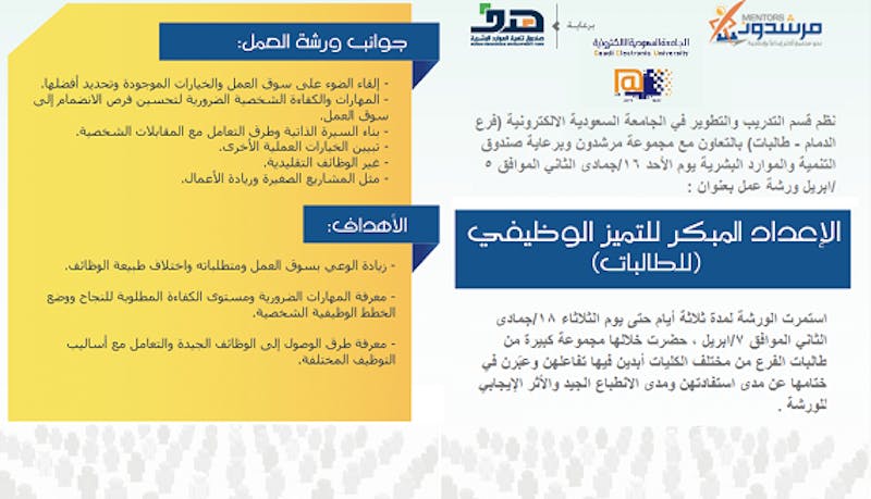 نظمت وحدة التدريب والتطوير بقسم الطالبات بفرع الدمام ورشة عمل بعنوان "الإعداد المبكر للتميز الوظيفي"، بالتعاون مع مجموعة مرشدون وبرعاية صندوق التنمية والموارد البشرية، وذلك يوم الأحد الماضي والتي استمرت لمدة ثلاثة أيام، سجلت فيها مجموعة من طالبات مختلف الكليات بالفرع، واللاتي عبّرن في ختام الدورة عن مدى الاستفادة المجنية من هذه الدورة متمنين تكرار تقديم مثل هذه الدورات مستقبلا لإعدادهن بالمهارات اللازمة ليواكبن سوق العمل.