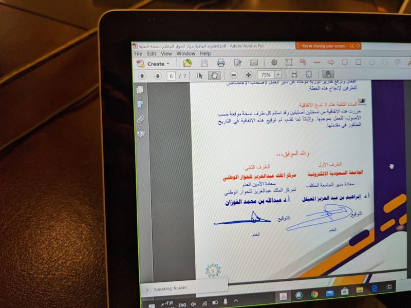 وقعت الجامعة السعودية الإلكترونية مذكرة تفاهم مع مركز الملك عبدالعزيز للحوار الوطني، وذلك عن بعد عبر منصة ويبيكس، اليوم الأحد الموافق 12\4\2020 عند الساعة الثانية ظهراً.