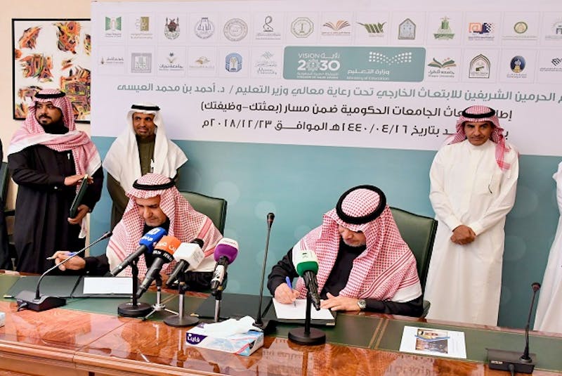 وقّع معالي وزير التعليم الدكتور أحمد بن محمد العيسى، اتفاقية تعاون مع 28 جامعة حكومية لسد احتياجاتها بأعضاء هيئة التدريس المبتعثين من برنامج خادم الحرمين الشريفين للابتعاث الخارجي ضمن مسار "بعثتك –وظيفتك" بعد إعدادهم وتأهيلهم وحصولهم على المؤهل المطلوب ليؤدوا دورهم المأمول في دعم التنمية الشاملة في المملكة، إنفاذا للأمر السامي القاضي بالسماح للجامعات بأن تبتعث عن طريق برنامج خادم الحرمين الشريفين، وذلك يوم الأحد بتاريخ 16 ربيع الثاني 1440 هـ، الموافق 23 ديسمبر 2018م.
