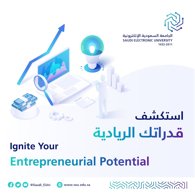 اختتمت الجامعة السعودية الإلكترونية برنامج "استكشف قدراتك الريادية" (Ignite Your Entrepreneurial Potential)، والذي أقيم خلال الفترة 2-3 يونيو 2023م بمشاركة طلبة وأعضاء هيئات تعليمية من 28 جامعة وكلية جامعة. والبرنامج عبارة عن سلسلة من الندوات وورش العمل قدمها نخبة من الخبراء والمختصين عن بعد للمساهمة في تبادل المعرفة والخبرات في ريادة الأعمال والابتكار وخلق الفرص لريادة الأعمال في مشاريع ابتكارية جديدة. وافتتحت السلسة بكلمة قدمها سعادة وكيل الجامعة لشؤون الفروع الدكتور حمد بن حسين بالحارث، أكد من خلالها على دور الجامعات المجتمعي لتوفير بيئة تعليمية خصبة تدعم الفكر الريادي وتشجع الطلبة وأعضاء الهيئات التعليمية على ابتكار الفكرة وإنتاج المشاريع الفريدة.