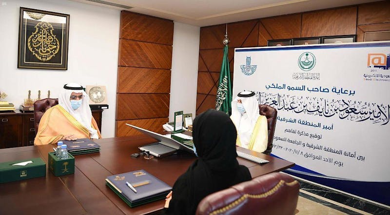 برعاية وحضور صاحب السمو الملكي الأمير/ سعود بن نايف بن عبدالعزيز، أمير المنطقة الشرقية، اليوم الأحد 22 ربيع الأول 1442هـ؛ في مقر إمارة المنطقة الشرقية بالدمام، توقيع مذكرة تفاهم بين أمانة المنطقة الشرقية والجامعة السعودية الإلكترونية.