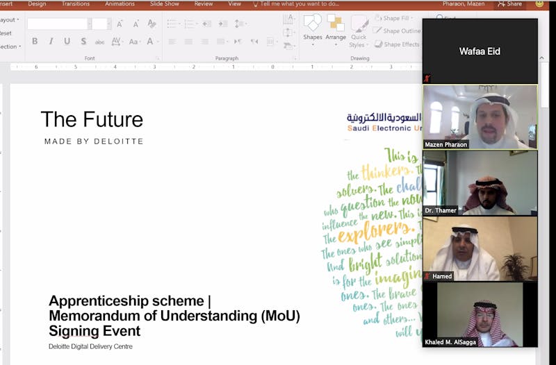 وقعت الجامعة السعودية الالكترونية، اليوم الاثنين الموافق 13 أبريل 2020م (عن بعد) مذكرة تعاون مع شركة ديلويت اند توش الشرق الأوسط المحدودة، لإطلاق مخطط تدريبي مهني مصمم من قبل الشركة وتمكينه من قبل الجامعة السعودية الإلكترونية.