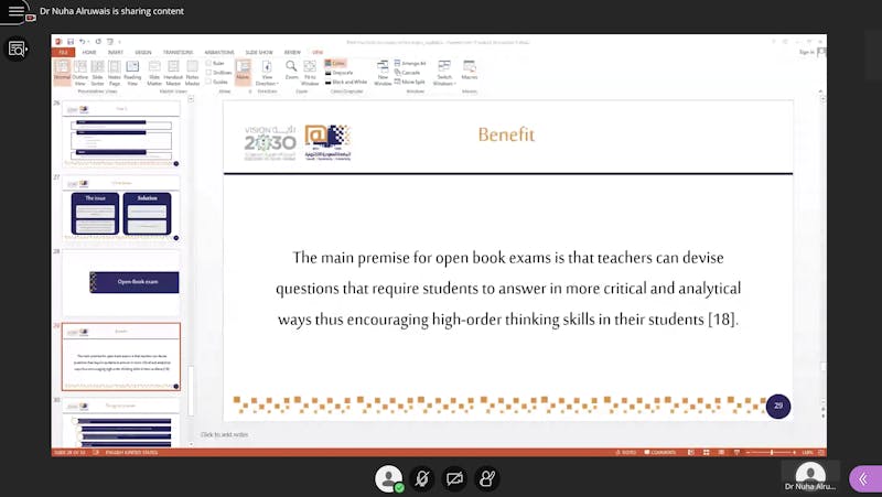 رغبة في الاستعداد للاختبارات المحوسبة وإكساب أعضاء هيئة التدريس المهارات اللازمة للتعامل مع قرار الجامعة السعودية الإلكترونية في التحول إلى الاختبارات عن بُعد، وضمان تحقيق أعلى معايير الجودة وصحة تقييمات الطلبة، أقامت الجامعة متمثلة بوكالة الجامعة للشؤون التعليمية، محاضرة تثقيفية لأعضاء هيئة التدريس (باللغتين العربية والإنجليزية) تحت عنوان: "الممارسة المثلى لإنشاء الاختبارات الإلكترونية"، قدمتها افتراضيًا عبر منصة البلاك بورد المستشارة في التقييم الإلكتروني الدكتورة نهى الرويس، وذلك يومي الأحد 25/06/1442 هـ، والأربعاء بتاريخ 28/06/1442 هـ، وحضرها أكثر من 350 عضو هيئة تدريس في مختلف التخصصات والفروع.