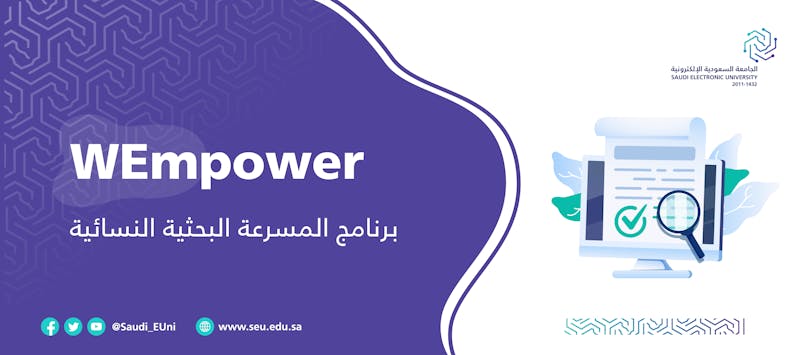 أطلقت الجامعة السعودية الإلكترونية برنامج المسرعة البحثية النسائية "WEmpower"، بمشاركة نخبة من الخبراء في البحث العلمي من عدد من الجامعات المحلية والمؤسسات الحكومية المرموقة وعضوات هيئة التدريس وطالبات الدراسات العليا، حيث يبدأ تنفيذ البرنامج بكافة مراحله افتراضيًا على مدى عشرة أيام متتالية من 15-26 أغسطس 2021م، بإشراف وكالة الجامعة للدراسات العليا والبحث العلمي.