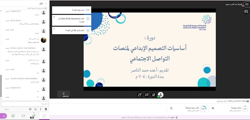 نظّمت عمادة شؤون الطلاب في الجامعة السعودية الإلكترونية، ممثلةً بوحدة إرشاد الموهوبين بوكالة الخدمات الطلابية، دورة تدريبية عبر منصة البلاك بورد بعنوان «التصميم لوسائل التواصل الاجتماعي»، قدّمتها الأستاذة هند الناصر، واستهدفت طلاب وطالبات الجامعة في مختلف مراكزها التعليمية.