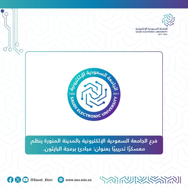 نظم فرع الجامعة السعودية الإلكترونية بالمدينة المنورة معسكرًا تدريبيًا عن بعد بعنوان: (مبادئ برمجة البايثون)، على مدى أربعة أيام، وذلك لطلبة الجامعة وفروعها.