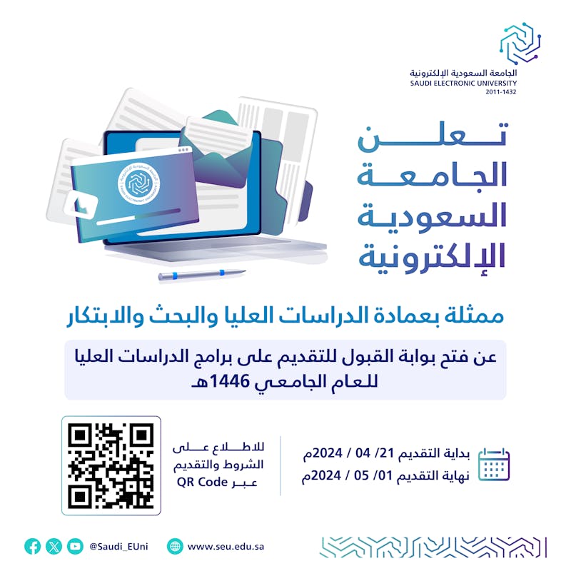 أعلنت الجامعة السعودية الإلكترونية عن بدء القبول في برامج الماجستير، للعام الجامعي القادم 1446هـ، وذلك ابتداءً من اليوم الأحد، ويستمر حتى 1 مايو 2024م