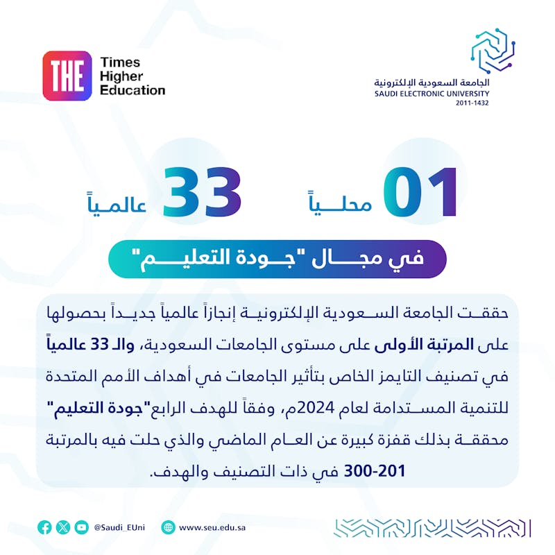 حققت الجامعة السعودية الإلكترونية إنجازًا عالميًا جديدًا بحصولها على المرتبة الأولى محليًا، والـ 33 عالميًا، في تصنيف التايمز الخاص بتأثير الجامعات في أهداف الأمم المتحدة للتنمية المستدامة لعام 2024م، وفقًا للهدف الرابع "جودة التعليم" محققة بذلك قفزة كبيرة عن العام الماضي والذي حلت فيه بالمرتبة 201-300 في ذات التصنيف والهدف.