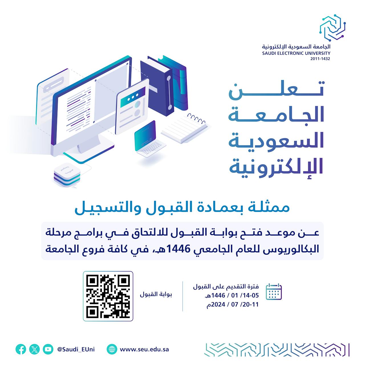 أعلنت الجامعة السعودية الإلكترونية، ممثلة بعمادة القبول والتسجيل عن موعد فتح بوابة القبول للالتحاق ببرامج مرحلة البكالوريوس للطلاب والطالبات للعام الجامعي 1446هـ، في كافة فروعها، وذلك ابتداءً من يوم الخميس 5 محرم 1446هـ الموافق 11 يوليو 2024م، وحتـى يـوم السبـت 14 محرم 1446هـ الموافق 20 يوليو 2024م.