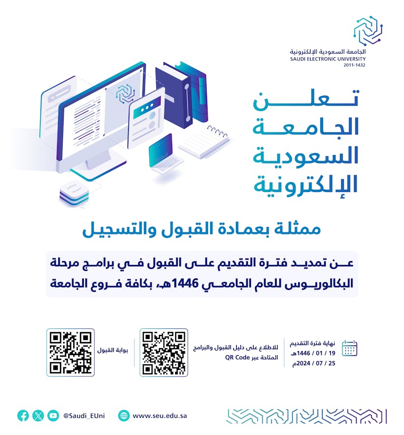 أعلنت الجامعة السعودية الإلكترونية اليوم عن تمديد فترة التقديم على برامج البكالوريوس للعام الجامعي ١٤٤٦، وذلك حتى يوم الخميس ١٩ من شهر محرم الجاري بكافة فروع الجامعة.