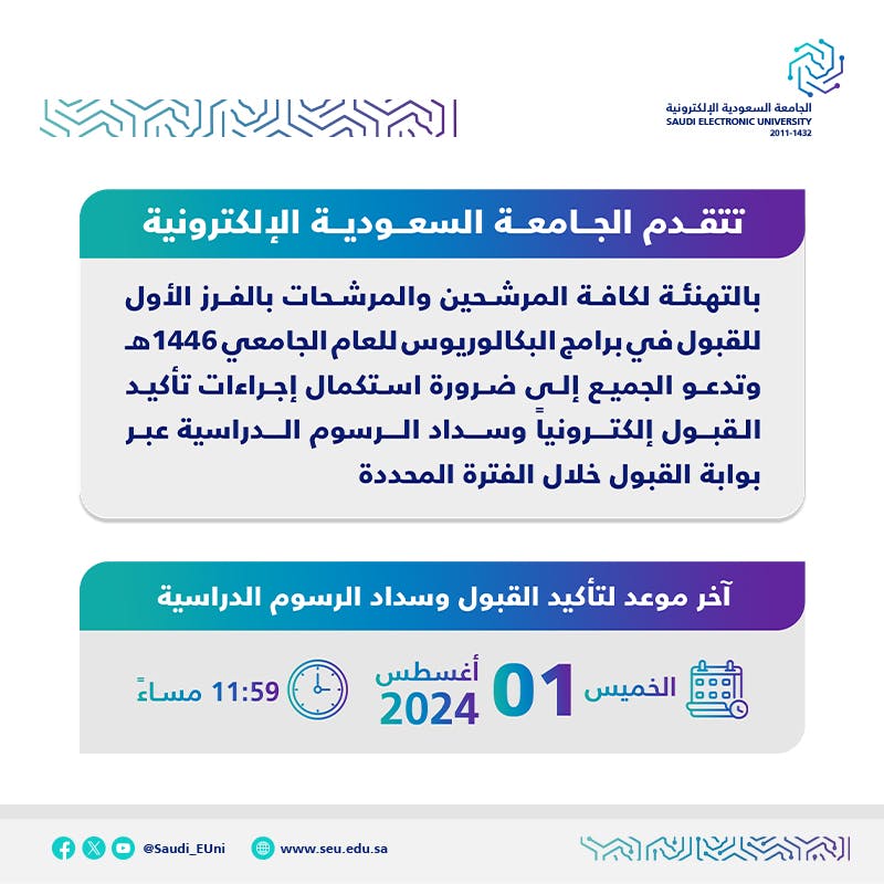 وأوضحت الجامعة أنه قد تم تحديد يوم الخميس القادم 2024/08/01م موعداً لنهاية فترة تأكيد الفرز الأول للقبول وذلك عبر بوابة القبول.
