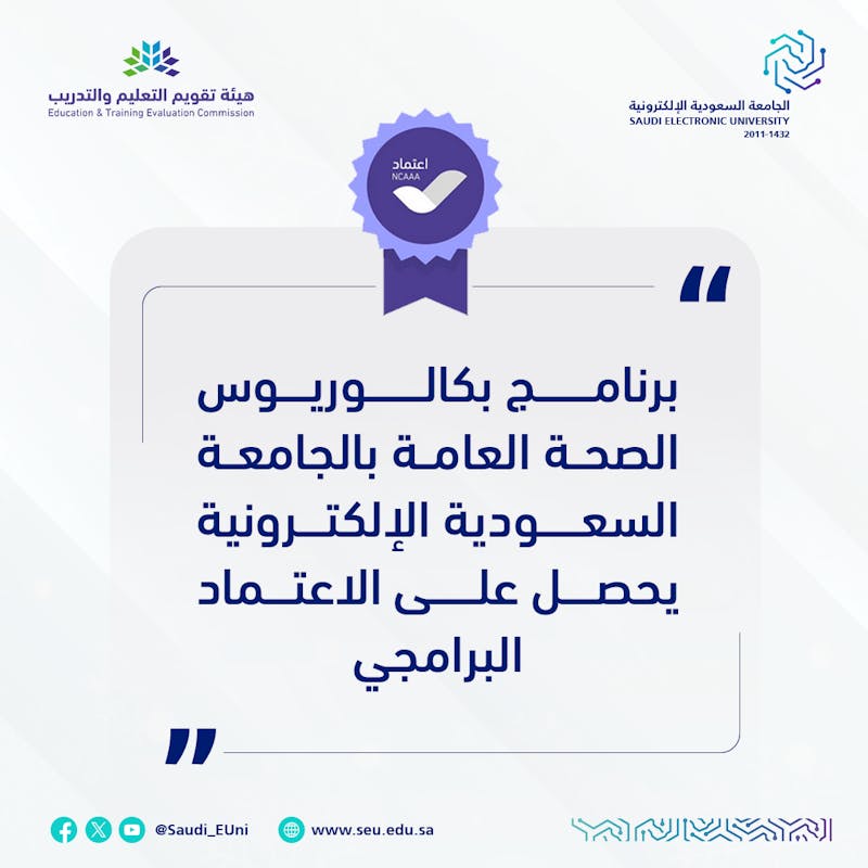 حصل برنامج بكالوريوس الصحة العامة في الجامعة السعودية الإلكترونية على الاعتماد البرامجي المشروط من هيئة تقويم التعليم والتدريب، ممثلةً بالمركز الوطني للتقويم والاعتماد الأكاديمي.