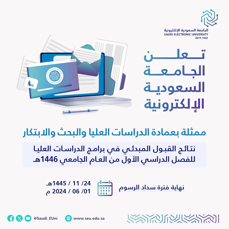 أعلنت الجامعة السعودية الإلكترونية ممثلة، بعمادة الدراسات العليا والبحث والابتكار، نتائج القبول المبدئي في برامج الدراسات العليا، للفصل الدراسي الأول من العام الجامعي 1446هـ.