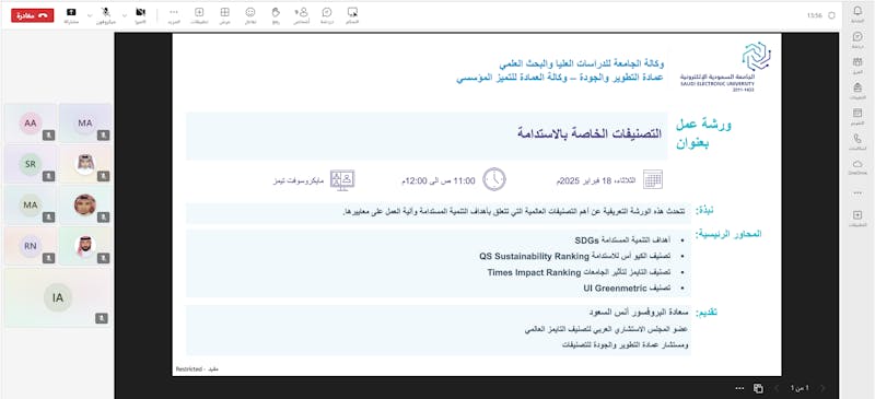 نظّمت عمادة التطوير والجودة، ممثلةً بوكالتها للتميز المؤسسي، اليوم الثلاثاء 18 فبراير 2025م، ورشة عمل افتراضية بعنوان "التصنيفات الخاصة بالاستدامة"، بهدف التعريف بأهداف التنمية المستدامة السبعة عشر، واستعراض أبرز التصنيفات العالمية المرتبطة بهذا المجال.