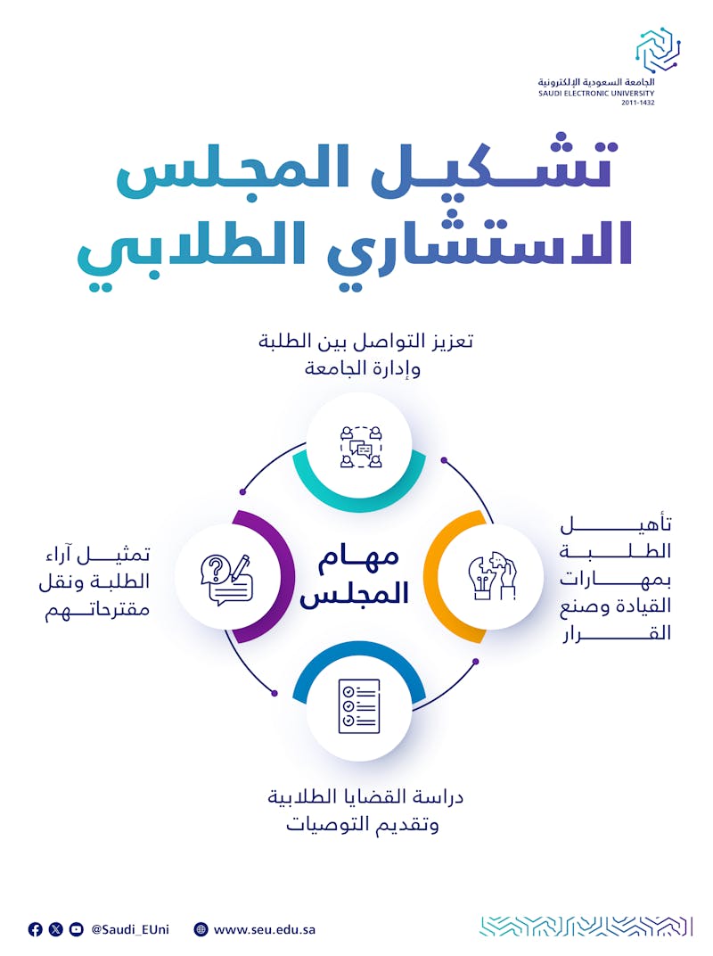ويعكس هذا القرار التزام الجامعة السعودية الإلكترونية بتعزيز دور الطلبة في المنظومة الأكاديمية وتمكينهم من المشاركة الفاعلة في تطوير البرامج والخدمات الجامعية، بما ينسجم مع استراتيجيتها في تقديم نموذج تعليمي حديث يدعم الإبداع والتميّز.
