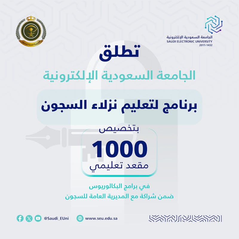 أطلقت الجامعة السعودية الإلكترونية، بالتعاون مع المديرية العامة للسجون، برنامجاً تعليمياً رائداً يتيح لنزلاء ونزيلات السجون استكمال تعليمهم الجامعي، عبر تخصيص (1000) مقعد في برامج البكالوريوس، وذلك ضمن التوجه الوطني لتعزيز حق التعلّم بوصفه ركيزة أساسية للإصلاح والتنمية، ودعم الاندماج المجتمعي الإيجابي للنزلاء.