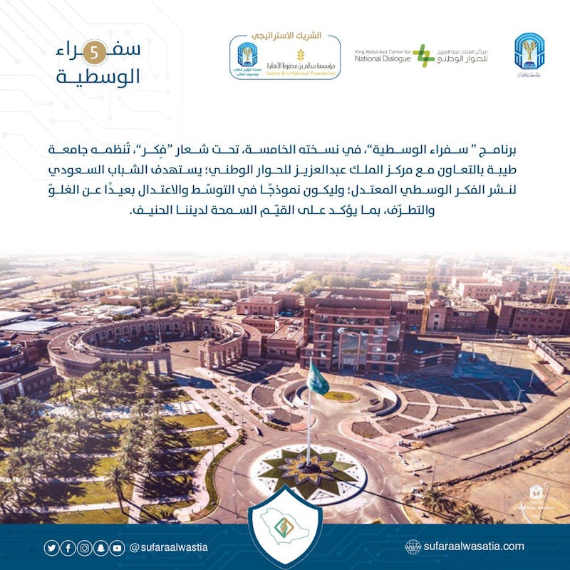 شارك عدد من طلاب وطالبات الجامعة السعودية الإلكترونية في برنامج سفراء الوسطية في نسخته الخامسة، والذي تنظمه جامعة طيبة بالتعاون مع مركز الملك عبد العزيز للحوار الوطني، بتشريف ورعاية صاحب السمو الملكي الأمير فيصل بن سلمان بن عبد العزيز أمير منطقة المدينة المنورة خلال الفترة من 26 إلى 28 يناير 2021م، بمشاركة 39 جامعة وكلية سعودية تحت شعار (فِكْر).