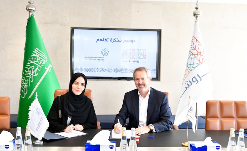 حيث وقع المذكرة سعادة رئيس الجامعة السعودية الإلكترونية الدكتورة ليلك بنت أحمد الصفدي، والرئيس التنفيذي لمجموعة روشن السيد ديفيد جروفر.