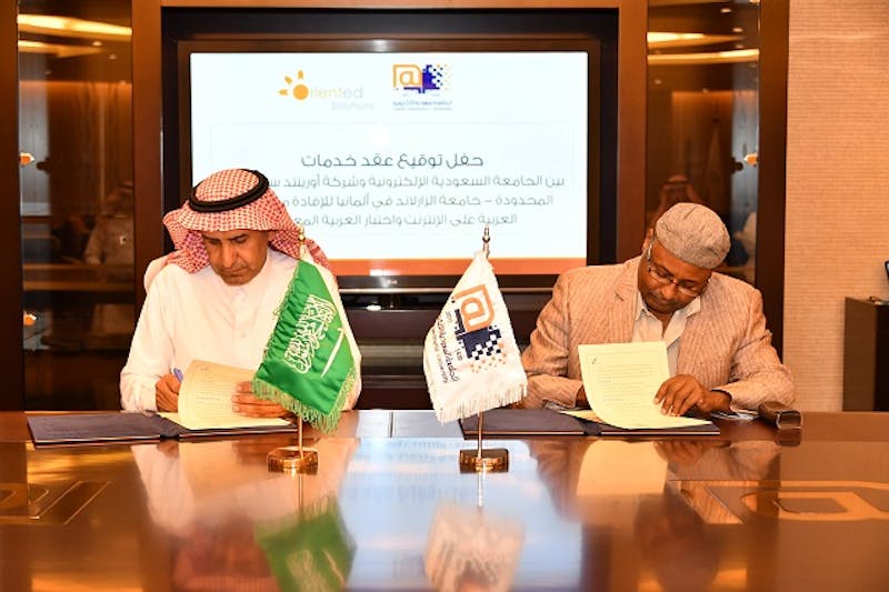 وقع سعادة مدير الجامعة الإلكترونية الأستاذ الدكتور عبدالله بن عبدالعزيز الموسى في مقر الجامعة الرئيسي بمدينة الرياض عقد خدمات تعليمية مع المهندس عامر محمد مدير شركة أورينتد سوليوشنز بجامعة الزارلاند بألمانيا، تفيد بموجبه جامعة زارلاند من برنامج العربية على الانترنت لتعليم العربية لغير الناطقين بها، واختبار العربية المعياري بوصفه مقياساً للكفاية اللغوية العربية؛ وذلك خدمة للغة العربية في ألمانيا وللراغبين بتعلمها من غير الناطقين بها.