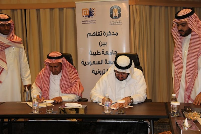 وقع معالي مدير جامعة طيبة الدكتور عبد العزيز بن قبلان السراني مذكرة تفاهم مع سعادة مدير الجامعة السعودية الإلكترونية الأستاذ الدكتور عبد الله بن عبد العزيز الموسى؛ لتعزيز التعاون بين الجامعتين، وخدمة العملية التعليمية، وتفعيل تبادل الخبرات والمعلومات، والاستفادة من المباني الجامعية، لتوفير تعليم عصري وفق أعلى معايير الجودة.