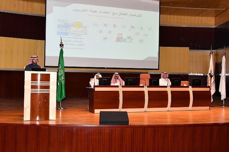 واستعرض د. الرحيمي الخدمات التعليمية الأساسية في الجامعة، وطريقة تسجيل الدخول لنظام (البلاك بورد)، ومعرفة محتوى المقرّر الدراسي، والفصول الافتراضية، إلى جانب شرح طريقة خدمات نظام إدارة التعلم من خلال الهواتف الذكية والأجهزة اللوحية. كما قدم نبذة عن بداية الدراسة في الفصل التحضيري ومقرراته، قبل أن يبدأ الطالب في الدراسة، مبيناً أن الجامعة تتبنى النظام المدمج في التعليم الإلكتروني الذي يتطلب الحضور المباشر للمحاضرات بنسبة 25%، أما النسبة الباقية 75% فتتوزع على حضور في الفصول الافتراضية، والمنتديات التعليمية، والمتابعة الدائمة لمحتويات التعليم الرقمي، مشيراً إلى بعض الاشتراطات الأخرى الخاصة بتخصص القانون، وما يتعلق باللغة الإنجليزية.