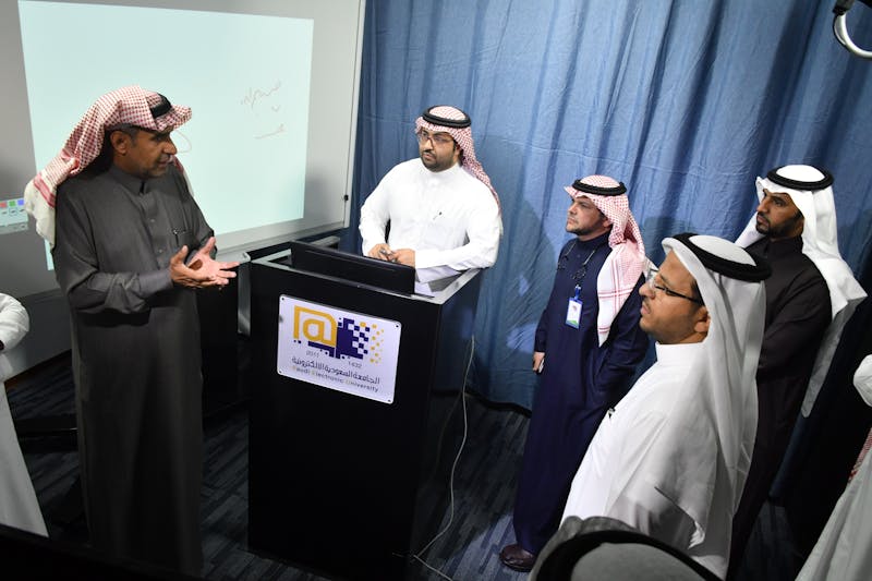 واطلع الدكتور النملة على ما تضمه الجامعة من فصول دراسية وأدوات وتطبيقات تقنية حديثة ومناهج دراسية متطورة، مقدمة بالتعاون مع جامعات وهيئات عالمية، حيث تقدم الجامعة تعليم نوعي، يختلف في شكله عن الجامعات التقليدية التي تعتمد على الحضور المباشر، فهي قائمة على نموذج التعليم المدمج، الذي يدمج الحضور الإلكتروني في تلقي العلوم والمعارف مع الحضور المباشر للطلبة بنسب متفاوتة.