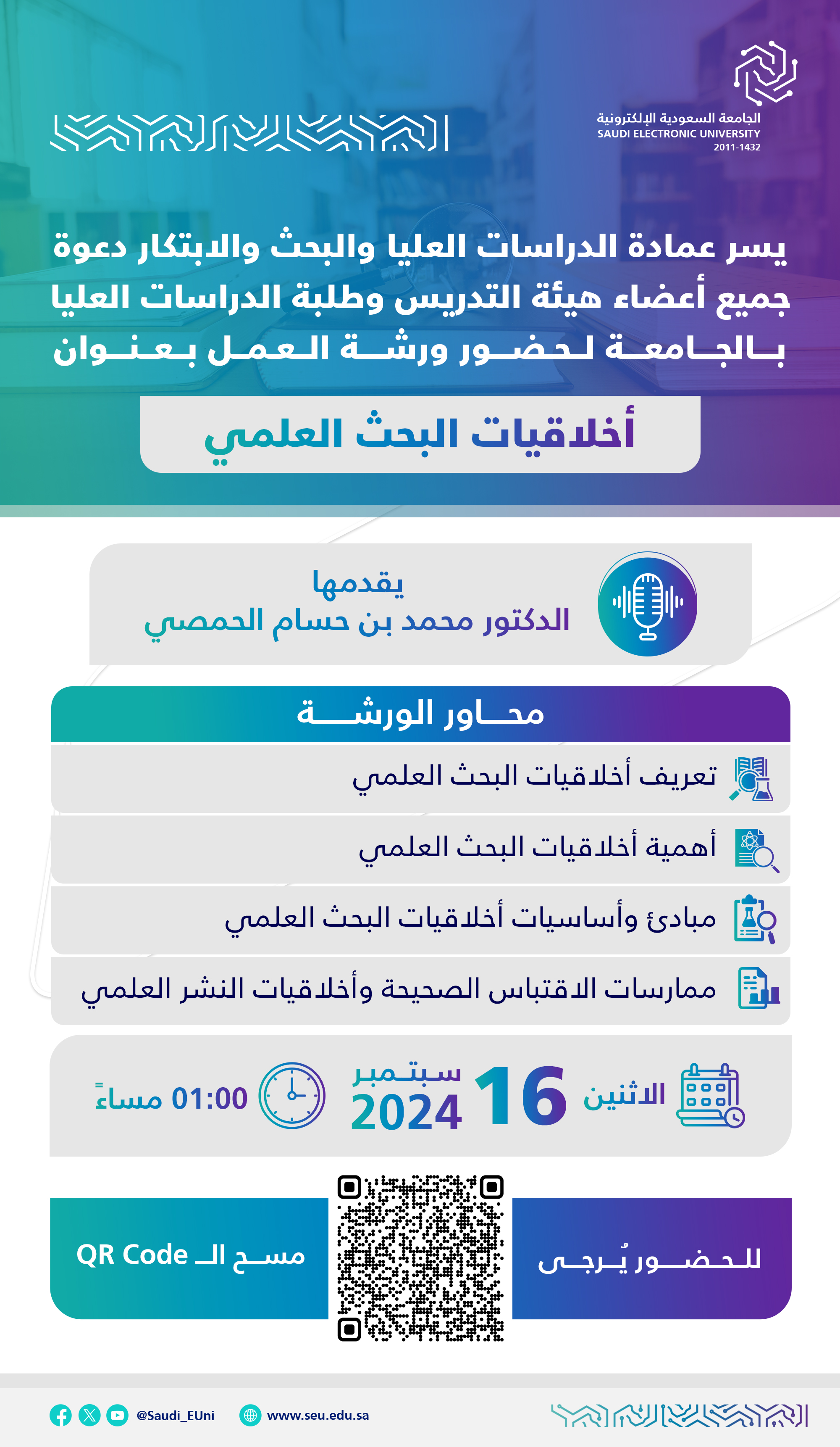 يسر عمادة الدراسات العليا و البحث والابتكار دعوة جميع أعضاء هيئة التدريس وطلبة الدراسات العليا بالجامعة لحضور ورشة العمل بعنوان أخلاقيات البحث العلمي