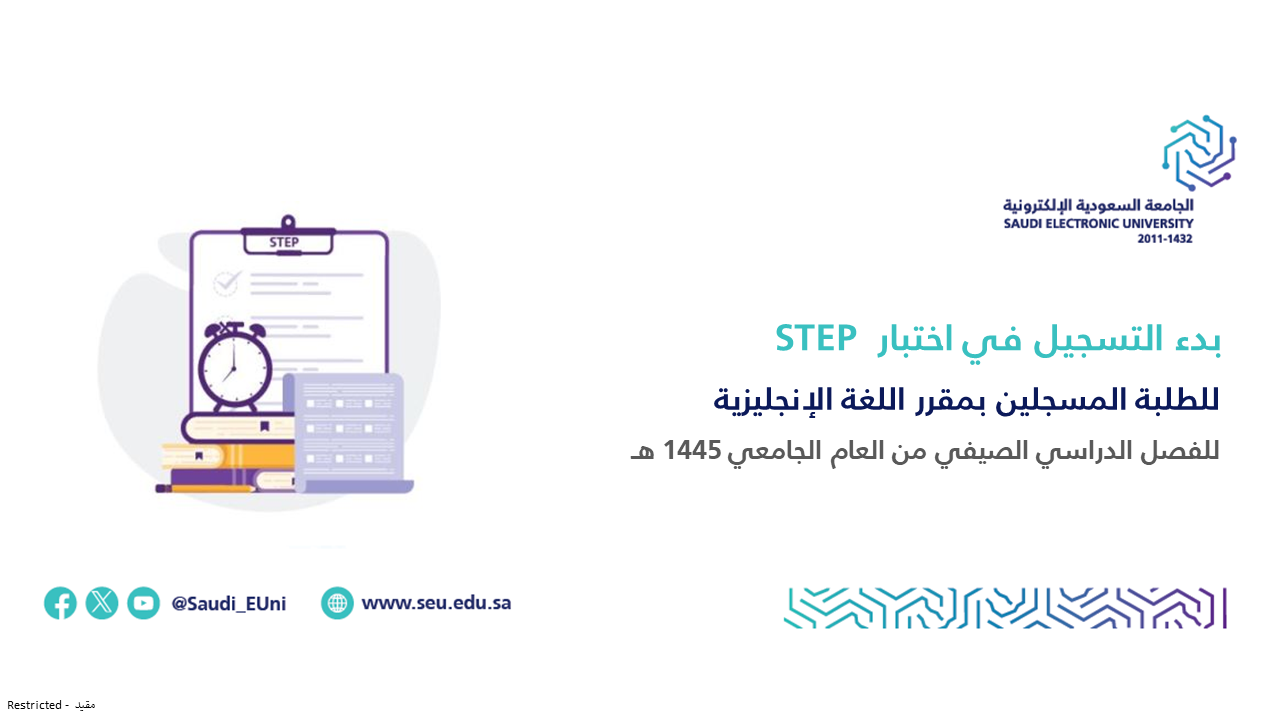 تعلن الإدارة العامة للسنة الأولى المشتركة للطلبة المسجلين بمقرر اللغة الإنجليزية للفصل الدراسي الصيفي من العام الجامعي 1445 بضرورة الدخول على موقع قياس والتسجيل في اختبارSTEP الفترة من 15/1/1446هـ إلى 4/2/1446هـ الموافق 21-7-2024 إلى 8-8-2024 وذلك قبل انتهاء المقاعد المحددة، كما أن رسوم الاختبار مدفوعة مسبقًا من قبل الجامعة.