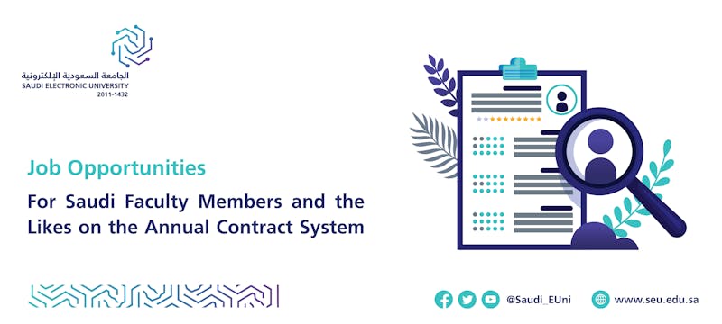 The Deanship of Human Resources at the Saudi Electronic University announces the availability of annual contract academic job opportunities for Saudis holding Master's and Doctorate degrees (female-male) for different colleges in the university and its branches; the conditions are as follow: