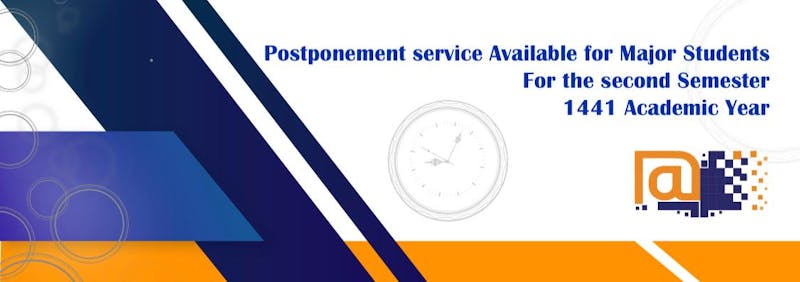 Dear students The Deanship of Admissions and Student Affairs is pleased to announce the requests for postpone semester via student services for bachelor students only for the second semester of academic year 1441 AH Start on Sunday, 17\05\1441 AH corresponding to 12\01\2020 AD and ends on Thursday, 28\05\1441 AH corresponding to 23\01\2020 AD at 02:00 PM We wish you all the best of luck and success Deanship of Admissions and Student Affairs