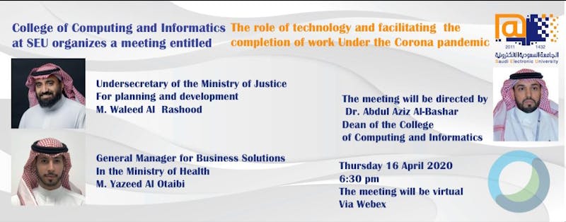 The College of Computing and Informatics at Saudi Electronic University is organizing a meeting titled: The Role of Technology and Facilitate the Completion of Work During the Corona Pandemic.
