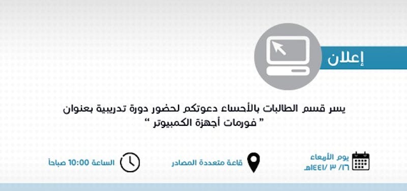 يسر قسم الطالبات بالأحساء دعوتكم لحضور دورة تدريبية بعنوان "فورمات أجهزة الكمبيوتر"