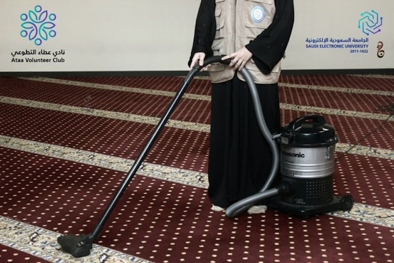 The Saudi Electronic University, Jeddah Branch (Female Section), organized a voluntary activity in collaboration with the "Ataa" Volunteer Club to clean and disinfect the university's prayer hall. This activity aligns with the university's commitment to providing a clean and comfortable environment for all its members, as well as encouraging volunteer work and instilling values of giving and initiative among students.