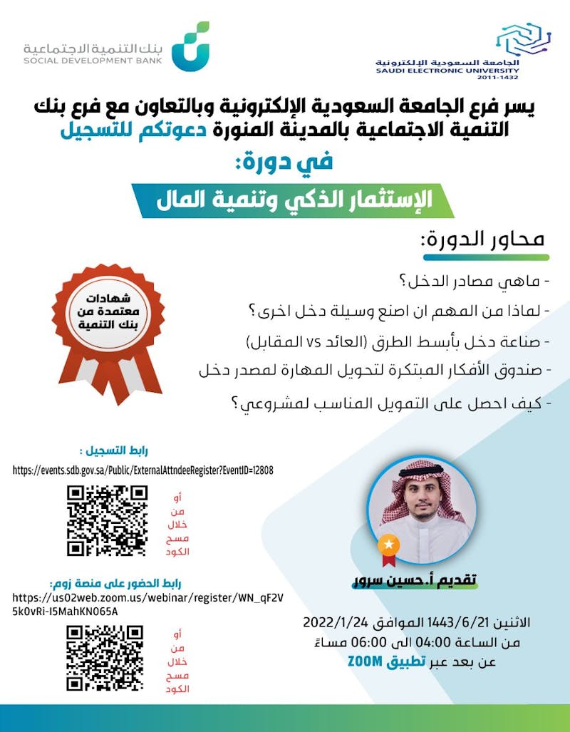 The Saudi Electronic University branch in Medina, in collaboration with the Branch of the Social Development Bank in Medina, held a training course through the Zoom platform entitled: "Smart Investment and Money Development", presented by Professor Hussein Srour, and targeted university students in various branches.