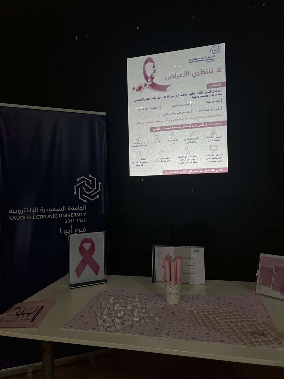 أقام شطر الطالبات بفرع الجامعة السعودية الإلكترونية في أبها فعالية التوعية بسرطان الثدي، بهدف رفع مستوى الوعي بأسباب الإصابة بالمرض والحد منه وتحفيز منسوبات الجامعة والطالبات بالكشف المبكر.