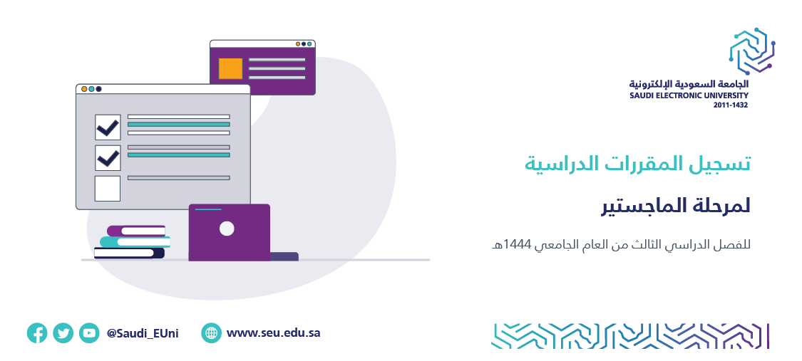 تعلن عمادة الدراسات العليا عن موعد بدء التسجيل لمقررات مرحلة الماجستير عبر النظام الطلابي Banner للفصل الدراسي الثالث من العام الجامعي 1444هـ