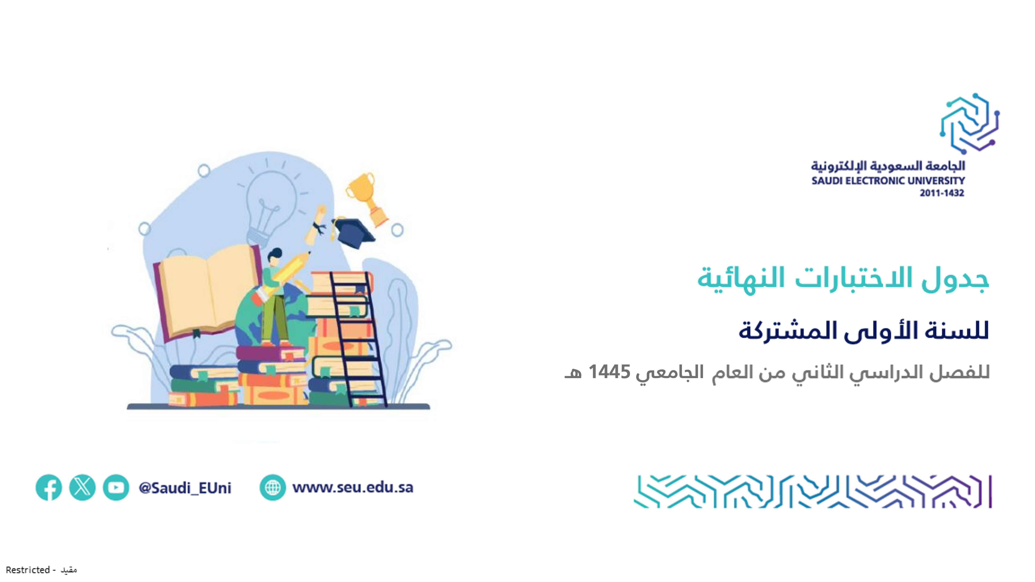 يسر الإدارة العامة للسنة الأولى المشتركة أن تعلن لطلبتها عن جدول الاختبارات النهائية للفصل الدراسي الثاني للعام الجامعي 1445هـ ـ