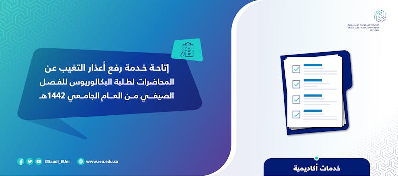 تعلن عمادة الدراسات العليا عن بدء خدمة تقديم أعذار التغيب عن المحاضرات لطلبة الماجستير للفصل الدراسي الصيفي من العام الجامعي 1442هـ.