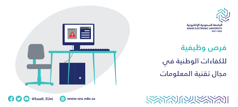 يسر عمادة الموارد البشرية بالجامعة السعودية الإلكترونية أن تعلن عن إتاحة فرص وظيفية للكفاءات الوطنية بنظام العقود السنوية في مجال تقنية المعلومات في مقرها الرئيسي بالرياض وفق المسميات التالية:( مهندس برمجيات، مطور برمجيات، مهندس شبكات، فني شبكات، فني دعم، محلل نظم، مختص قواعد بيانات، مختص أمن معلومات، مصمم)