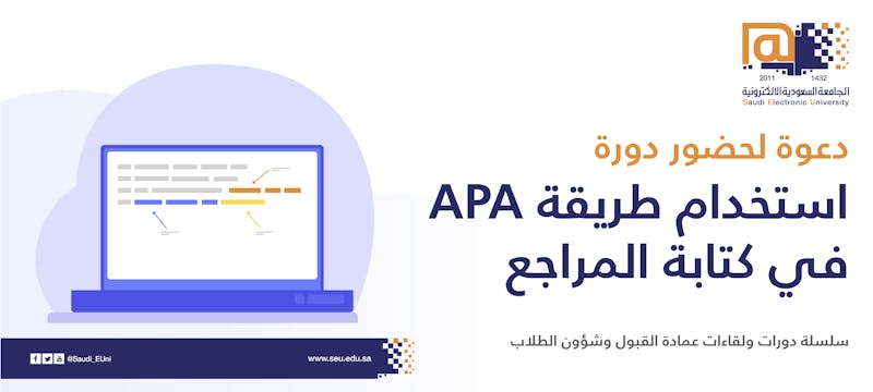 تعلن عمادة القبول وشؤون الطلاب عن دعوتكم لحضور محاضرة بعنوان: استخدام طريقة APA في كتابة المراجع.