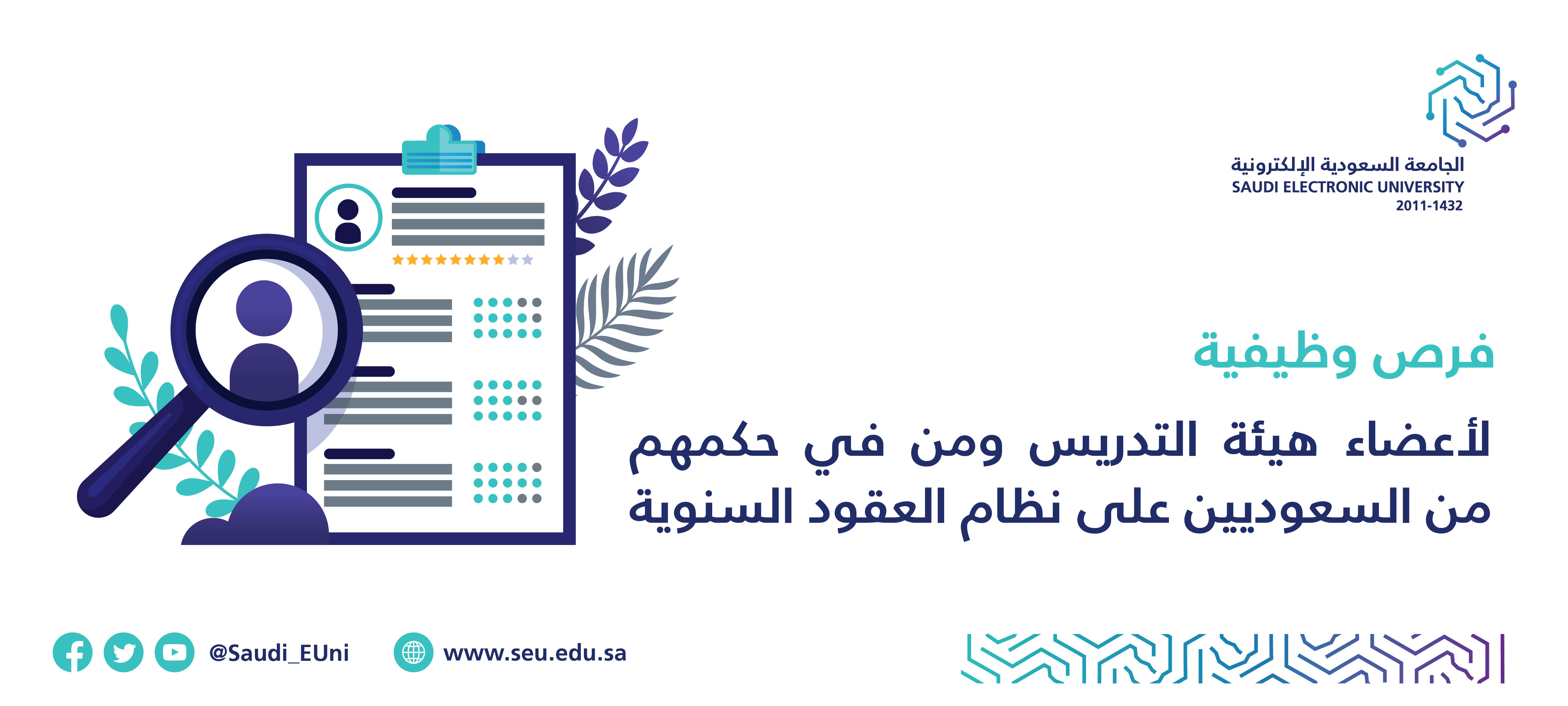 تعلن عمادة الموارد البشرية بالجامعة السعودية الإلكترونية عن إتاحة فرص وظيفية أكاديمية على نظام العقود السنوية لحملة الماجستير والدكتوراه من السعوديين (رجالًا ونساء) في مختلف كليات الجامعة وفروعها، وذلك وفقًا للشروط التالية: