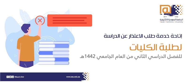 يبدأ تقديم طلب الاعتذار عن الدراسة للفصل الدراسي الثاني عبر الخدمات الطلابية لطلبة الكليات فقط يوم الأحد الموافق 04\06\1442 هـ