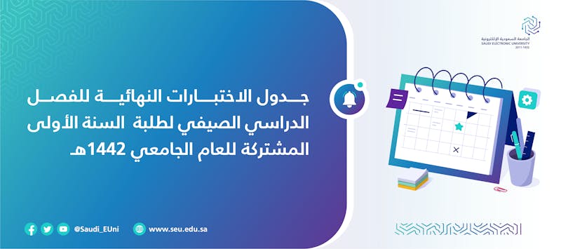 تعلن عمادة السنة الأولى المشتركة عن جداول الاختبارات النهائية لطلبة السنة الأولى المشتركة للفصل الدراسي الصيفي للعام الجامعي 1442هـ ـ والموحد بين جميع فروع الجامعة بقسمي (الطلاب/الطالبات).