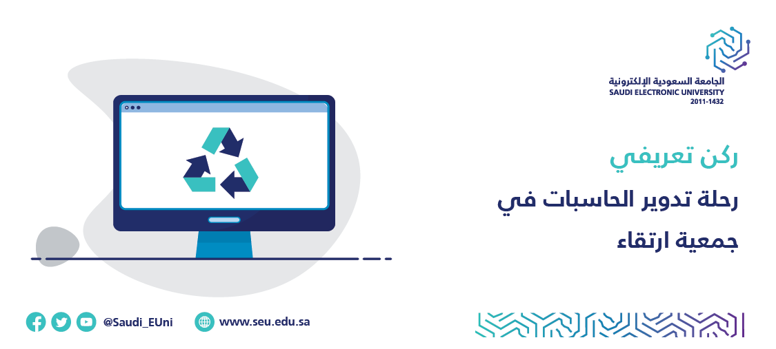تسعد الجامعة السعودية الالكترونية متمثلة بفرعها بالرياض بإقامة ركن تعريفي بالتعاون مع جمعية ارتقاء للتعرف على رحلة تأهيل الحاسب الآلي ومراحل إعادة التدوير