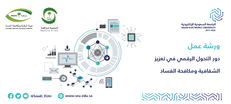 يسرعمادة القبول وشؤون الطلاب متمثلة بنادي نزاهة الطلابي بالتعاون مع هيئة الرقابة ومكافحة الفساد دعوتكم لحضور ورشة عمل بعنوان: دور التحول الرقمي في تعزيز الشفافية ومكافحة الفساد