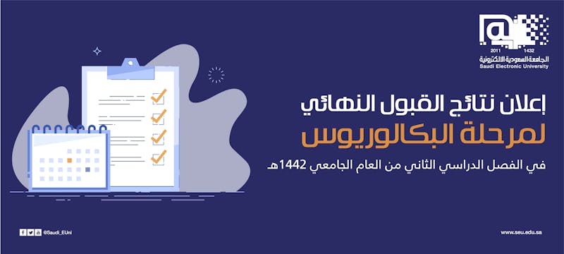 تهنئ الجامعة السعودية الإلكترونية الطلبة الحاصلين على القبول النهائي لمرحلة البكالوريوس للفصل الدراسي الثاني من العام الجامعي 1442هـ