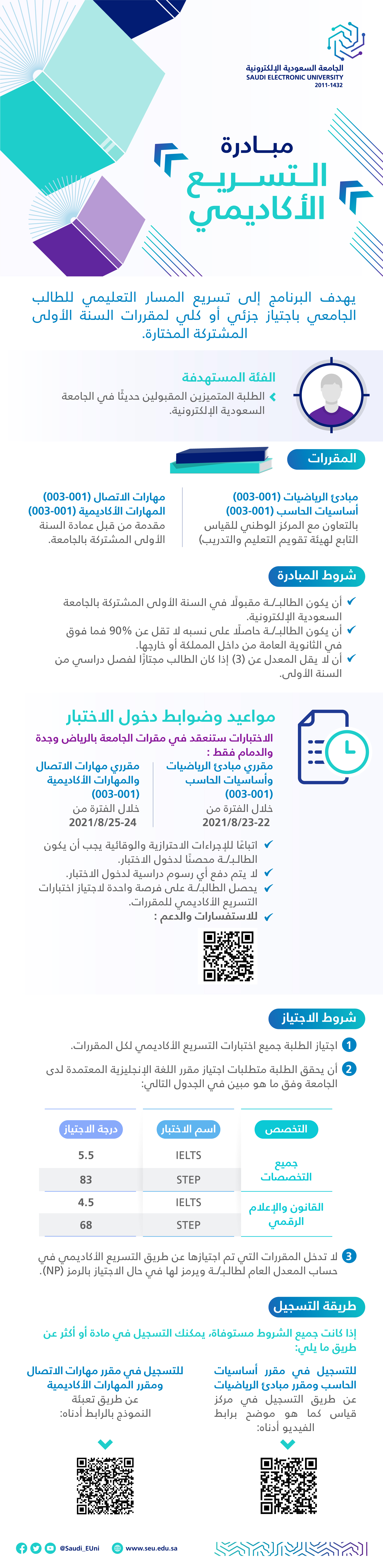 تُعلن عمادة السنة الأولى المشتركة عن إتاحة التسجيل لطلبتها (المتميزين) في برنامج التسريع الأكاديمي لمواد السنة الأولى المشتركة: