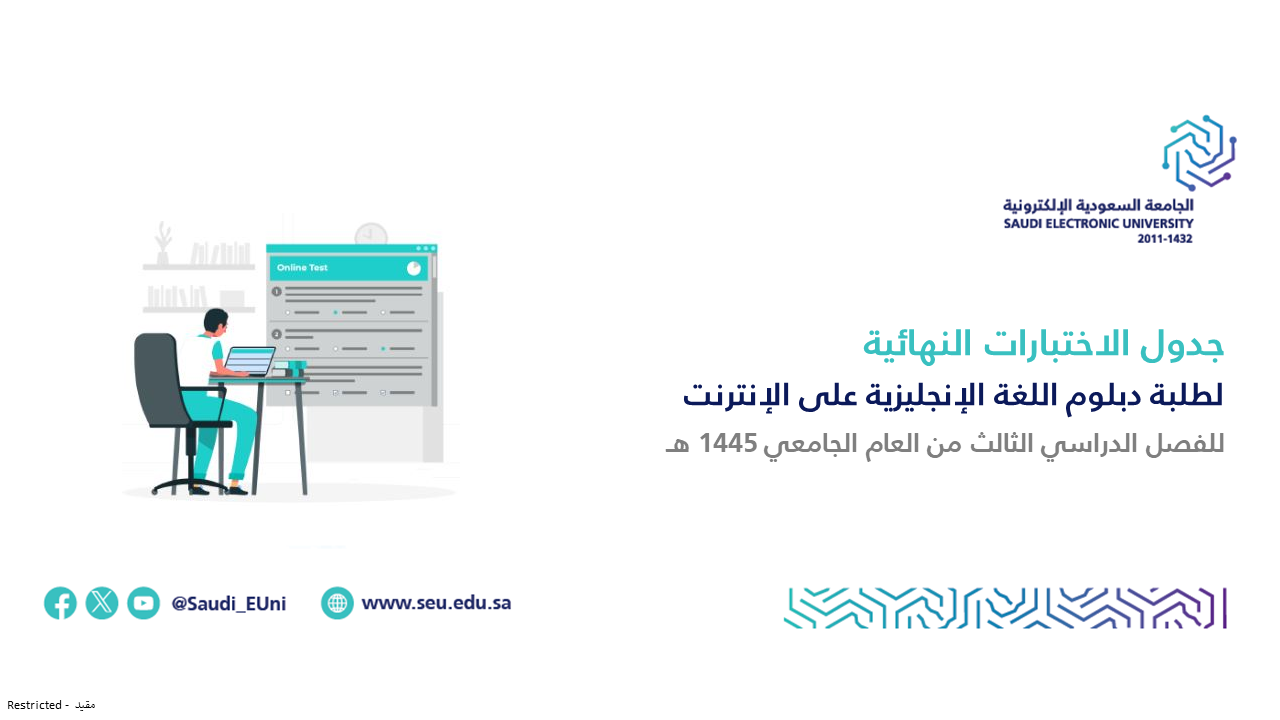 جدول الاختبارات النهائية لطلبة دبلوم اللغة الإنجليزية على الإنترنت للفصل الدراسي الثالث للعام الجامعي 1445هـ