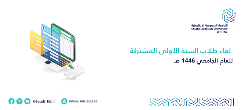 تعلن عمادة القبول والتسجيل عن إقامة لقاء لطلبة السنة الأولى المشتركة وذلك يوم الخميس 16 صفر 1446 الموافق 22 أغسطس 2024 في الساعة الرابعة مساء.